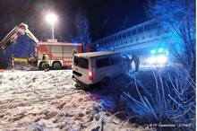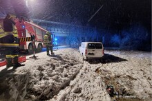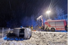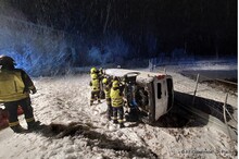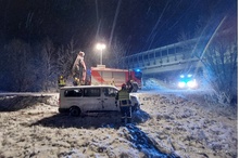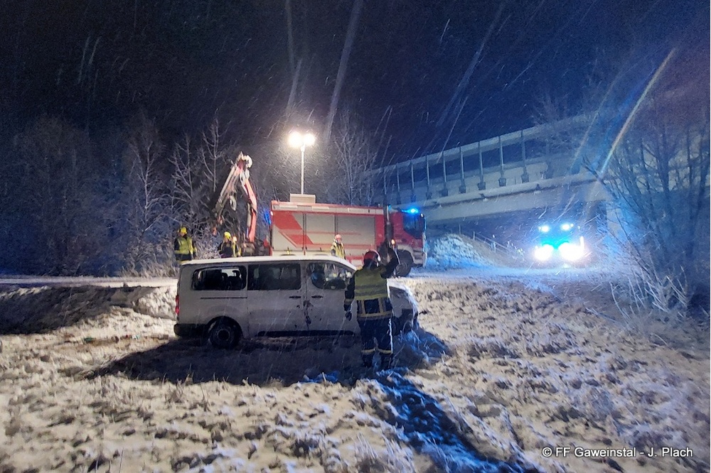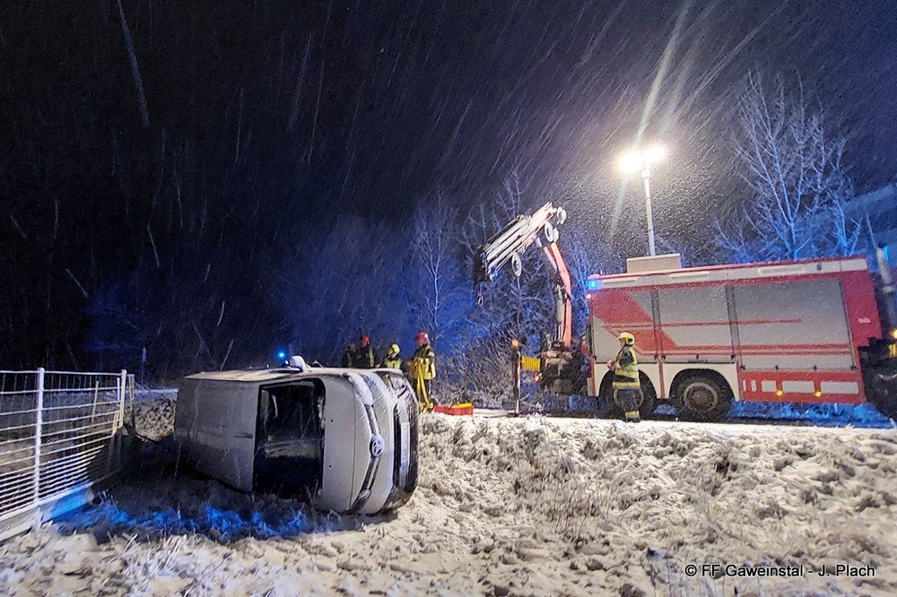 Ein Kleinbus war aufgrund einer falschen Navigationsanzeige auf einen Feldweg geschickt worden. Wegen der winterlichen Fahrbedingungen kam das Fahrzeug in einer Kurve von der Fahrbahn ab und blieb auf der Seite liegen. Die Insassen konnten unverletzt das Fahrzeug verlassen und die Polizei verständigen. Diese wiederum alarmierte die Feuerwehr.
